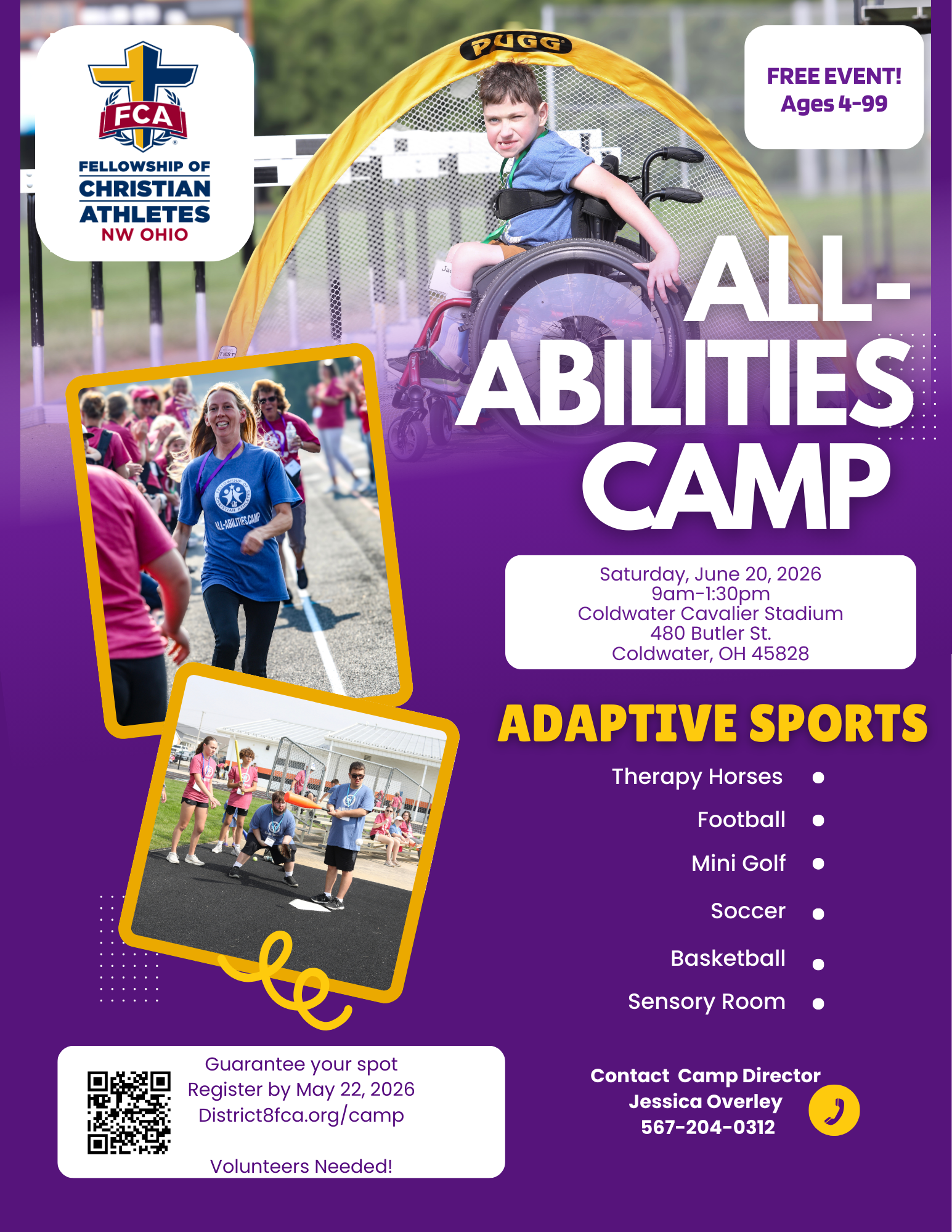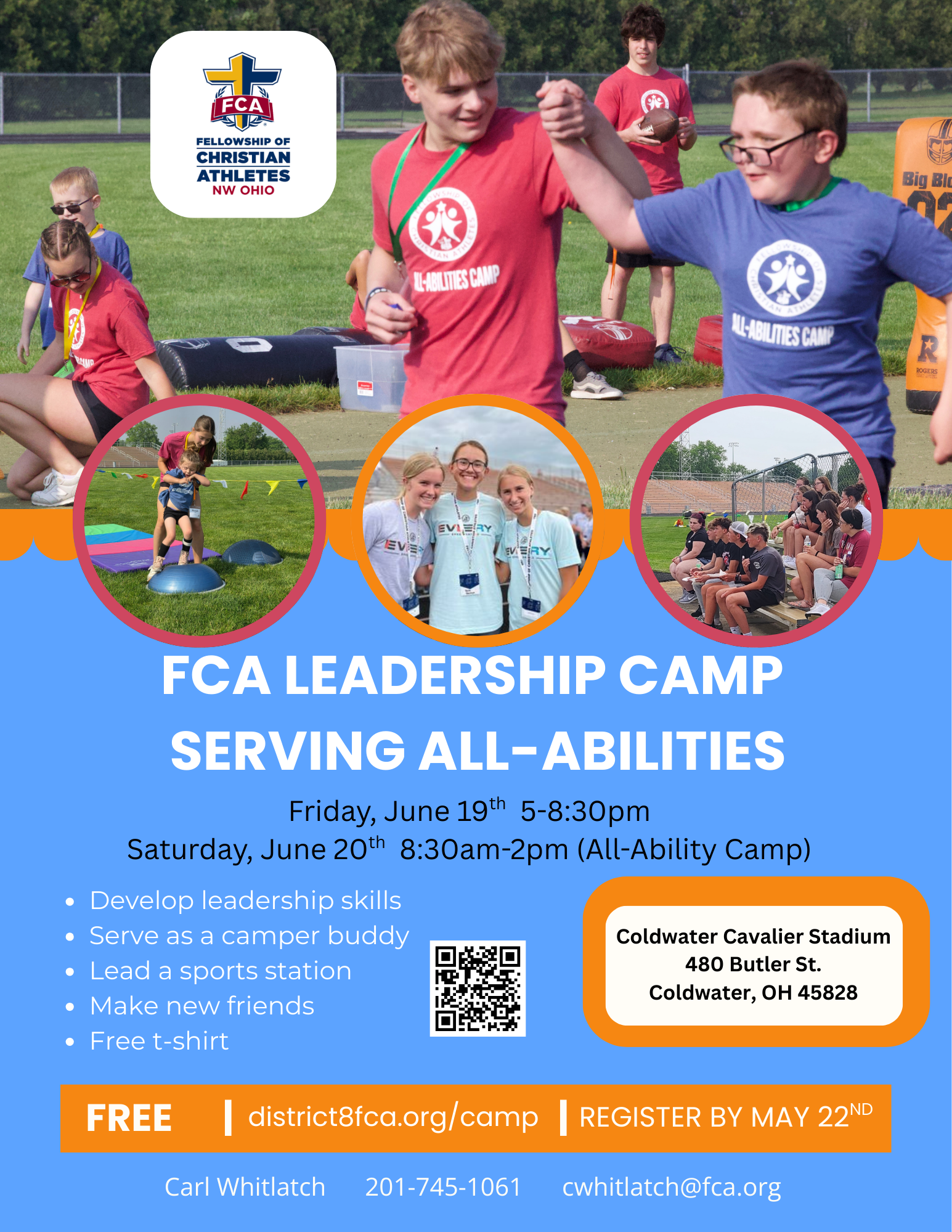 Leadership campers will develop leadership skills in a Christ-centered environment on Friday evening from 5pm-8:30pm (we will feed you!) and then implement those new skills on Saturday during the All Ability Camp, volunteering as camper buddies or as a sports station assistant. There is NO COST to you for this camp.